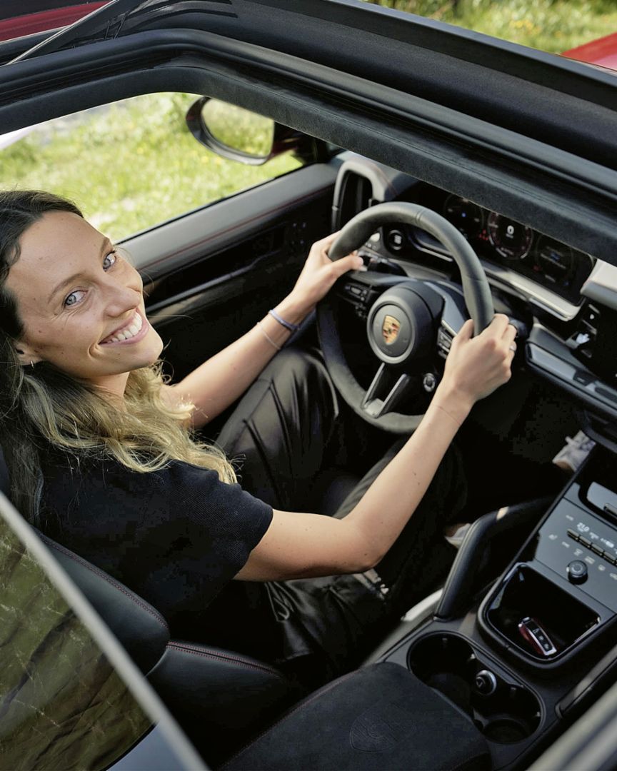 Der Cayenne GTS verfügt serienmäßig über ein GT-Sportlenkrad mit Lenkradkranz in Race-Tex inklusive Lenkradheizung und Mode-Schalter. Sein für schnelle Lenkbewegungen optimierter Durchmesser von 360 Millimetern sorgt für besonders gutes Handling bei sportlicher Fahrweise. Am Lenkrad befinden sich auch der Mode-Schalter für die Wahl der Fahrmodi und der Sport Response Button zur schnellstmöglichen Leistungsentfaltung von Motor und Getriebe.„Sportlicher Typ“, stellt die mehrfache Weltmeisterin im Freiwasserschwimmen Leonie Beck fest, als sie dem Cayenne GTS zum ersten Mal begegnet – mit seinen breiten Schultern, den Carbon-Außenspiegeln, den abgedunkelten HD-Matrix-LED-Hauptscheinwerfern und den roten Bremssätteln. Die Schwimmerin steigt ein, stellt sich die Sportsitze ein und man merkt: Die zwei verstehen sich.