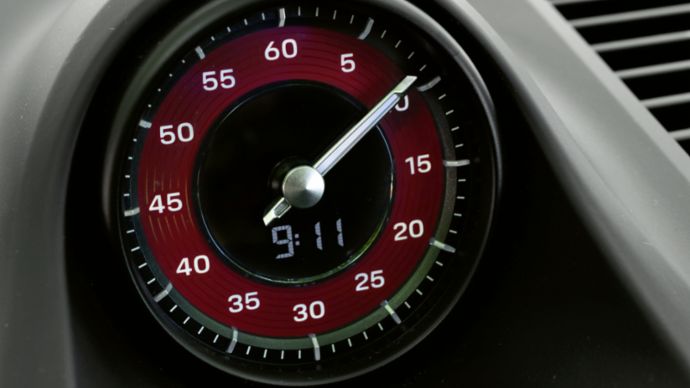 Das Ziffernblatt der Sport Chrono-Stoppuhr (mit digitalem Drehzahlmesser) kann in verschiedenen Farben bestellt werden. Ebenfalls optional wird das Porsche-Wappen in die Armauflage der Mittelkonsole geprägt, die serienmäßig mit dem angenehmen rauleder-ähnlichen Gewebe Race-Tex überzogen ist.