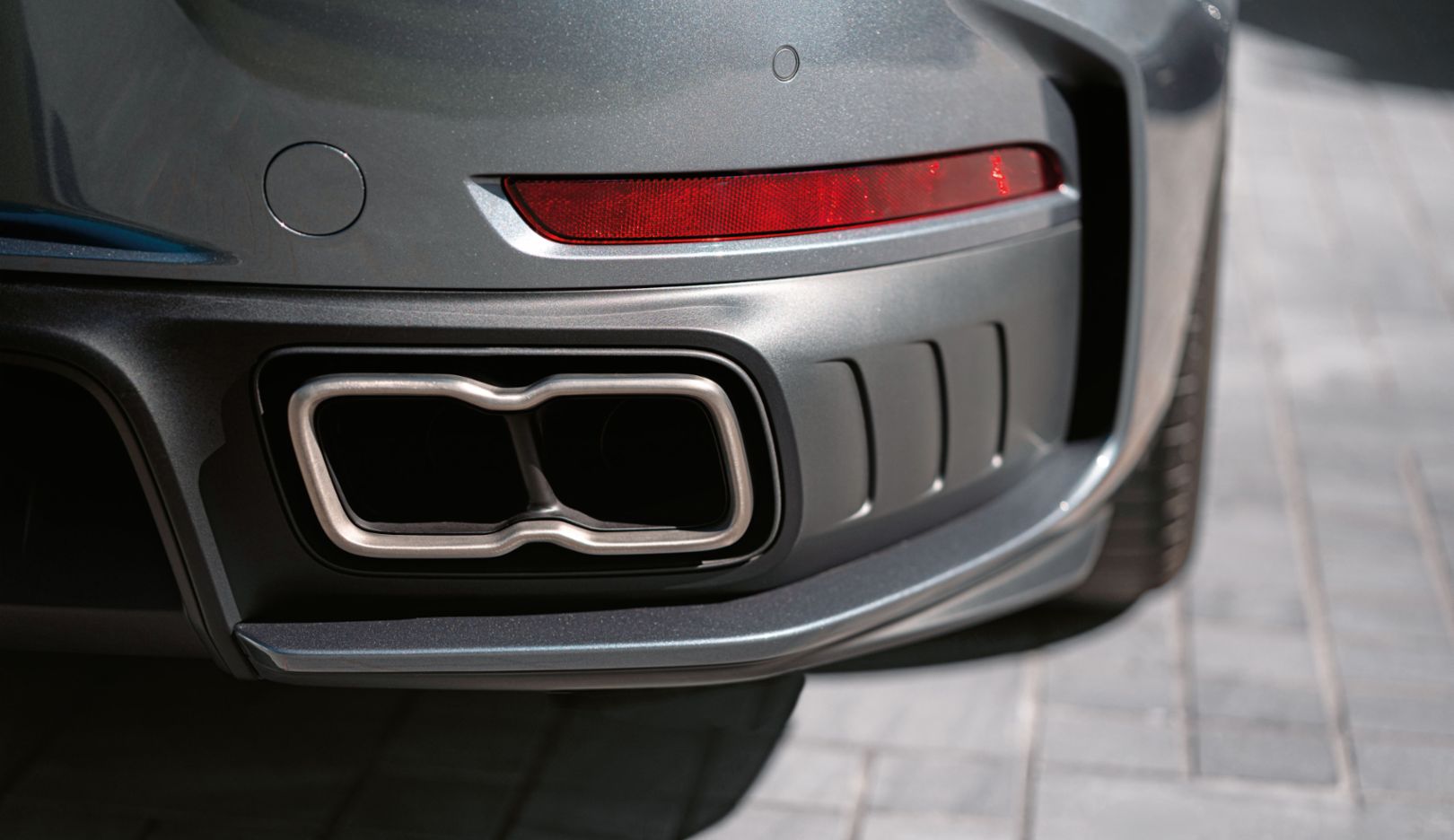 Turbotypisch: Am neu gestalteten Heckteil betonen markante Entlüftungsöffnungen die Breite. Die Endrohre der Abgasanlage in turbotypischem, neu interpretiertem Design signalisieren die Ausnahmestellung des Turbo S ebenso wie eine dynamische Perlenstruktur oberhalb des Rückleuchtenbandes. Optional sind ovale Endrohrblenden mit einer speziellen Struktur erhältlich.