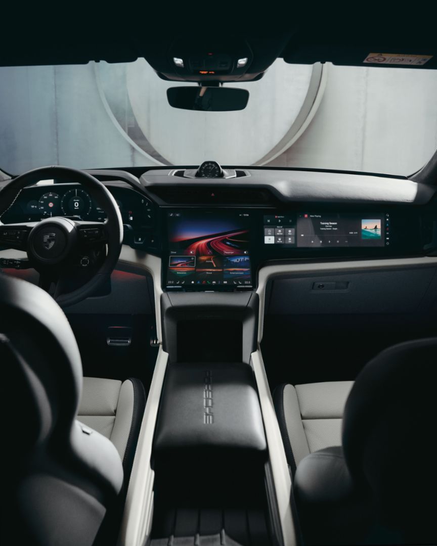 Digital: Herzstück der größten Displayfläche, die je in einem Porsche verbaut wurde, ist das Flow Display – ein gebogenes OLED-Panel, das sich nahtlos in die Mittelkonsole einfügt. Hinzu kommen ein Kombiinstrument mit 14,25-Zoll-OLED-Technologie und ein 14,9 Zoll großes, optionales Beifahrerdisplay. Streaming- und Gaming-Funktionen sowie der KI-gestützte Voice Pilot heben das digitale Erlebnis auf ein neues Niveau.