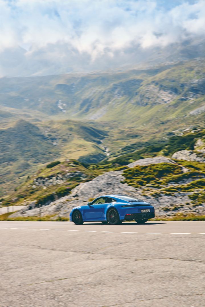 Die Farbe steht für Vertrauen, Kommunikation und Klarheit. Besser lässt sich ein 911 nicht beschreiben.Und genau das zu Tage fördert, was den 911 ausmacht: Er ist kein blosses Fortbewegungsmittel, sondern ein Wegbegleiter, der Emotionen perfekt transportiert. Er stellt eine Verbindung zwischen Fahrer:in und Strasse her und macht Fahrdynamik perfekt und ungefiltert erlebbar. Er zeigt, dass die Farbe durchaus auch ein Spiegel der Seele eines Autos sein kann. Denn der 911 verkörpert nicht nur die Lebensfreude, die in Lugano omnipräsent ist. Er wird auch dem Anspruch gerecht, dass der Uni-Farbton auf Sportlichkeit hindeutet. Eine Farbe, die sich nicht nur perfekt um die Karosserie des Sportwagens schmiegt. Sie integriert sich auch nahtlos in das Farbenspiel auf dem Pass: Das goldene Licht der Abendsonne legt sich über die grünen Wiesen, die silbern schimmernden Felsen und das tiefe Blau des Sees auf der Passhöhe. All das springt ins Auge, während im Augenwinkel der Kotflügel in Luganoblau den perfekten Rahmen bildet. Was wäre die Welt ohne Farben?