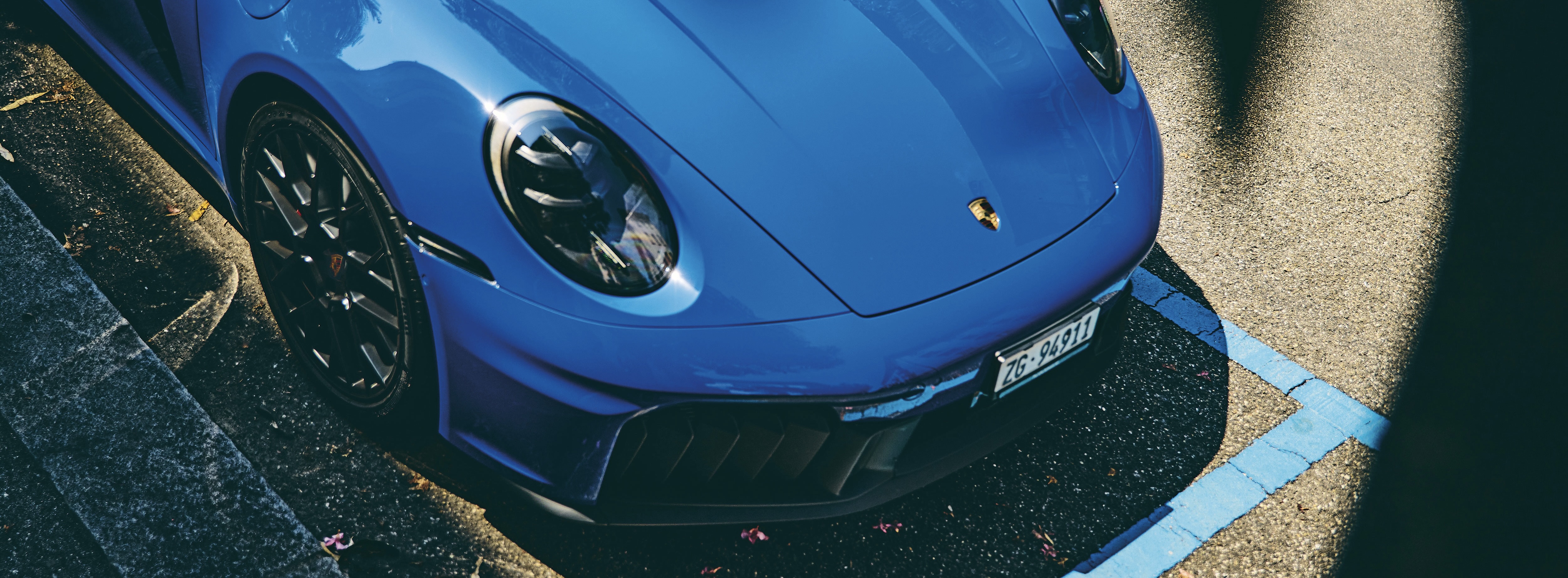 Eine Persönlichkeit, die auch perfekt zum Porsche 911 der neuesten Generation passt. Erst recht zum 911 Carrera GTS mit t-hybrid-Antriebskonzept. Dank E-Turbolader, cleverem Energiemanagement und einer ins Getriebe integrierten E-Maschine verbindet es Effizienz mit purer Lebensfreude: direktes Ansprechverhalten, kräftiger Durchzug und gierige Drehfreude, gepaart mit dem einzigartigen Klang eines Sechszylinder-Boxermotors (911 Carrera GTS: Kraftstoffverbrauch* kombiniert (WLTP) 11,0 – 10,4 l/100 km, CO₂-Emissionen* kombiniert (WLTP) 248 – 236 g/km, CO₂-Klasse G , CO₂-Klasse gewichtet kombiniert G ). Wie die Farbe Blau in Lugano synonym für la dolce vita steht, so bringt sie bei einem Porsche das Wesen der Technik perfekt zum Ausdruck: In der Farbpsychologie wird Blau oft mit Vertrauen, Kommunikation und Klarheit assoziiert. Werte, die der 911 in jeder Kurve und auf jedem gefahrenen Meter kompromisslos lebt.