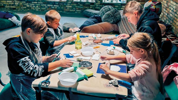 In den Kreativzentren von Art Helps dürfen Kinder und Jugendliche malen, basteln, fühlen und Potenziale entfalten (oben). Von den Kindern gebastelte Papierblumen leuchten vor einem schwer beschädigten Wohnblock in der Ukraine (unten).