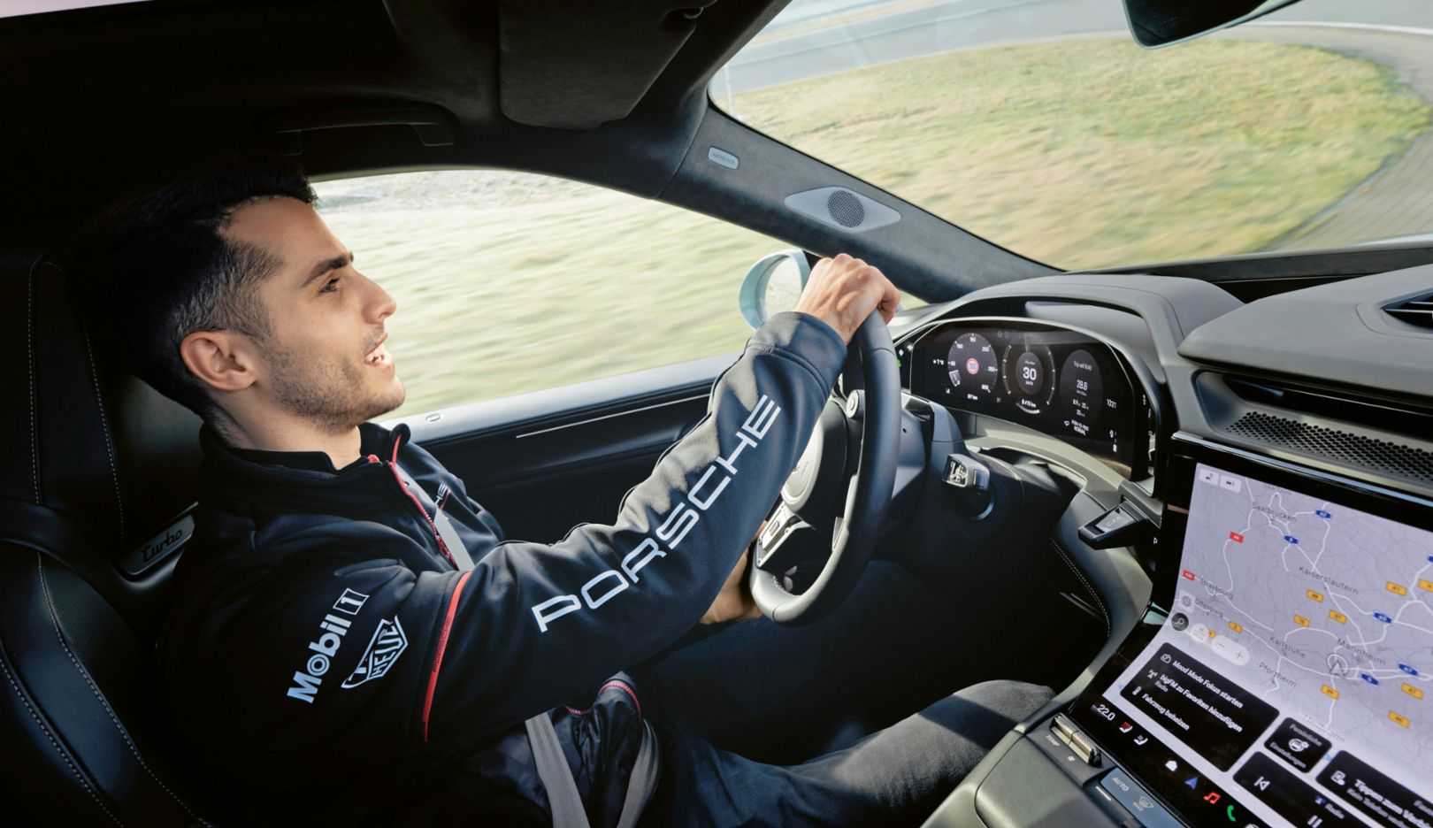 Stichwort fahren: Nach dem Interview ging es für den Motorsportprofi endlich auf den Rundkurs. Die Performanz des Cayenne Turbo Electric hinterließ Eindruck.