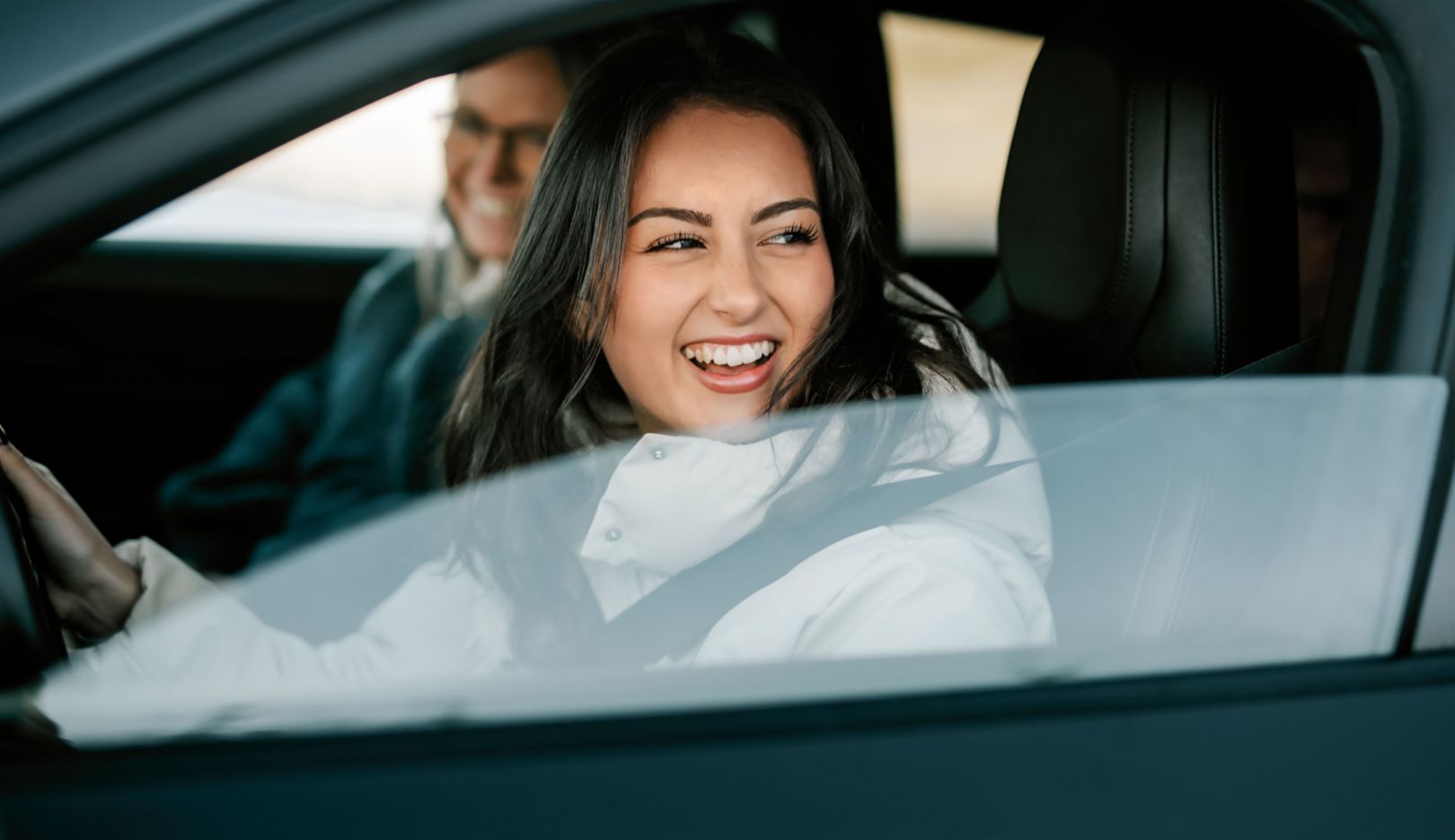 Sonja Petersen, con Margerita Sotomayor durante una clase de conducción en el Taycan. El rostro de la alumna refleja su alegría.Sonja Petersen observa el tráfico siempre con atención, pero no le preocupa que un descuido de uno de sus alumnos pueda causar un arañazo en el vehículo. «Más bien tengo la impresión de que, en el Taycan, los alumnos conducen con una atención especial. No obstante, también tengo mis propios pedales por si acaso...», comenta riendo. Tras más de un año de excelentes experiencias con el coche de la autoescuela, Petersen se plantea una pregunta cada vez más a menudo. «En algún momento, tendré que enfrentarme a un problema: ¿qué coche será el próximo?».