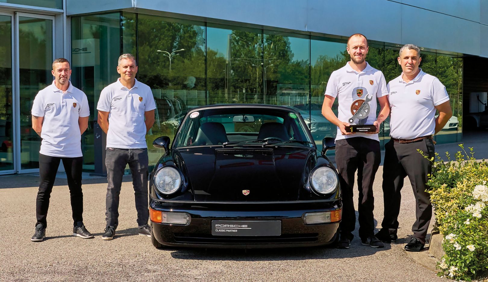 Alan, Christophe, Bastien et Wilfried, l’équipe Classic de Vélizy.Une histoire n’est belle que si elle est partagée. Chaque étape de la restauration a ainsi été photographiée et filmée pour être partagée à la large communauté Porsche, très active sur les réseaux sociaux. C’est ainsi qu’elle a pu suivre, pas à pas, le travail de Wilfried et de Bastien Pigot, technicien spécialisé Classic, sur la partie mécanique, entièrement démontée, rénovée puis remontée dans les règles de l’art, toujours en s’astreignant à rester fidèle aux pièces d’origine. Christophe Da Silva, Responsable Carrosserie, et Alain Dubois, peintre, se sont quant à eux chargés du travail titanesque sur la caisse. Restait l’étape ô combien délicate de la mise en couleur. Défi encore rehaussé par la teinte noire de la 911 type 964 RS, la plus difficile à travailler, la moindre imperfection sautant immédiatement aux yeux. De l’avis du jury, la mise en peinture effectuée par l’équipe de Vélizy n’avait rien à envier à une peinture réalisée en usine.