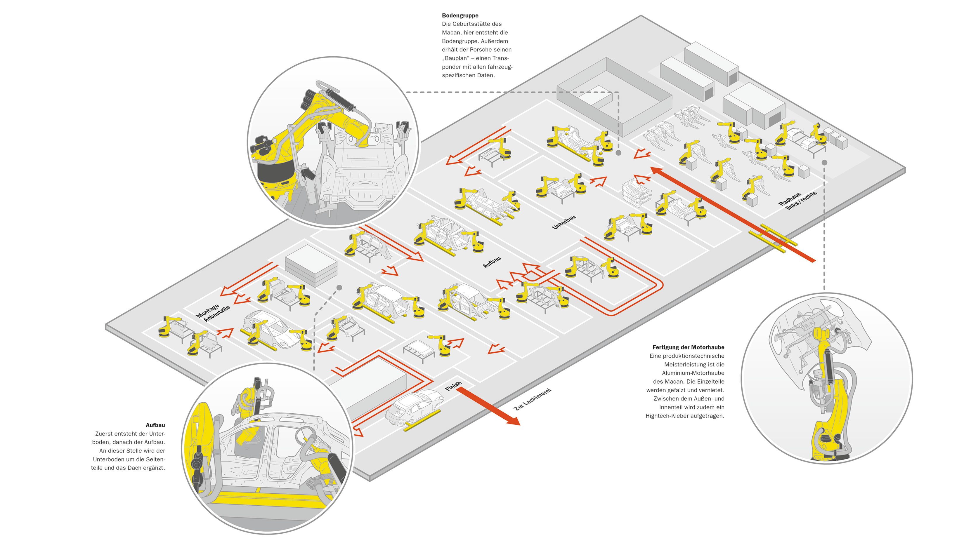Die Bodengruppe bittet zum Tanz. An der Station 1810 im neuen Karosseriebau des Porsche-Werks Leipzig vollführen drei gelbe Roboter ihre perfekte Choreografie. Sie schweißen den vorderen und hinteren Boden sowie die vorderen Radhäuser samt Federbeinaufnahmen und Längsträgern zusammen. Fließende, beinahe menschliche Bewegungen. Der Macan entsteht von unten nach oben. An Station 1810 wird er getauft – ab hier spricht man von einem Fahrzeug – und erhält seine Geburtsurkunde in Form eines Transponders mit dem fahrzeugspezifischen Identifizierungscode.