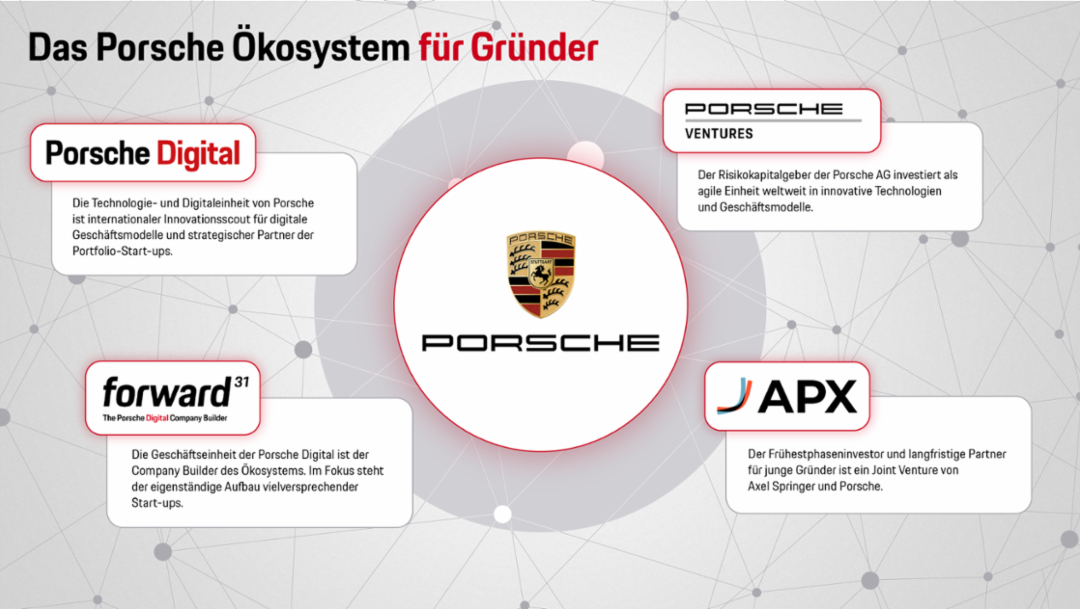 Der Company Builder Forward31 ist eine Geschäftseinheit von Porsche Digital. Im Fokus steht der Aufbau eines Portfolios vielversprechender Startups, die neue Zielgruppen und Wertschöpfungsketten jenseits des Kerngeschäfts Automobil erschließen. Diese werden gemeinsam mit Entrepreneuren als eigenständige Unternehmen gegründet, begleitet und weiterentwickelt. Zum global agierenden Team mit Sitz in Berlin gehören Experten aus Design, Produkt-, Software- und Geschäftsentwicklung.