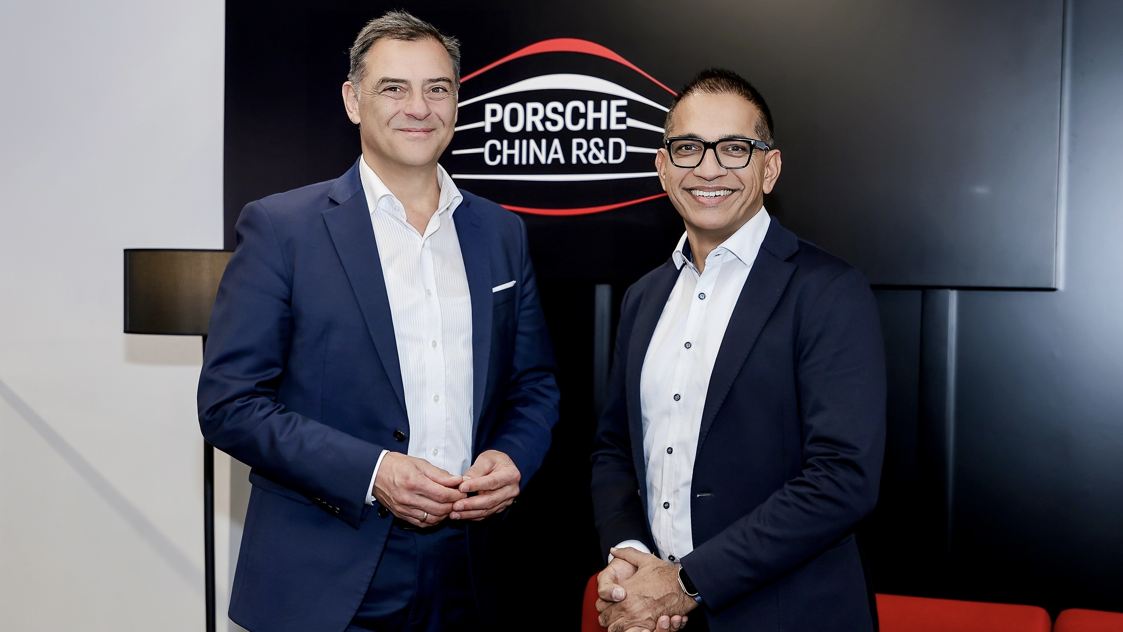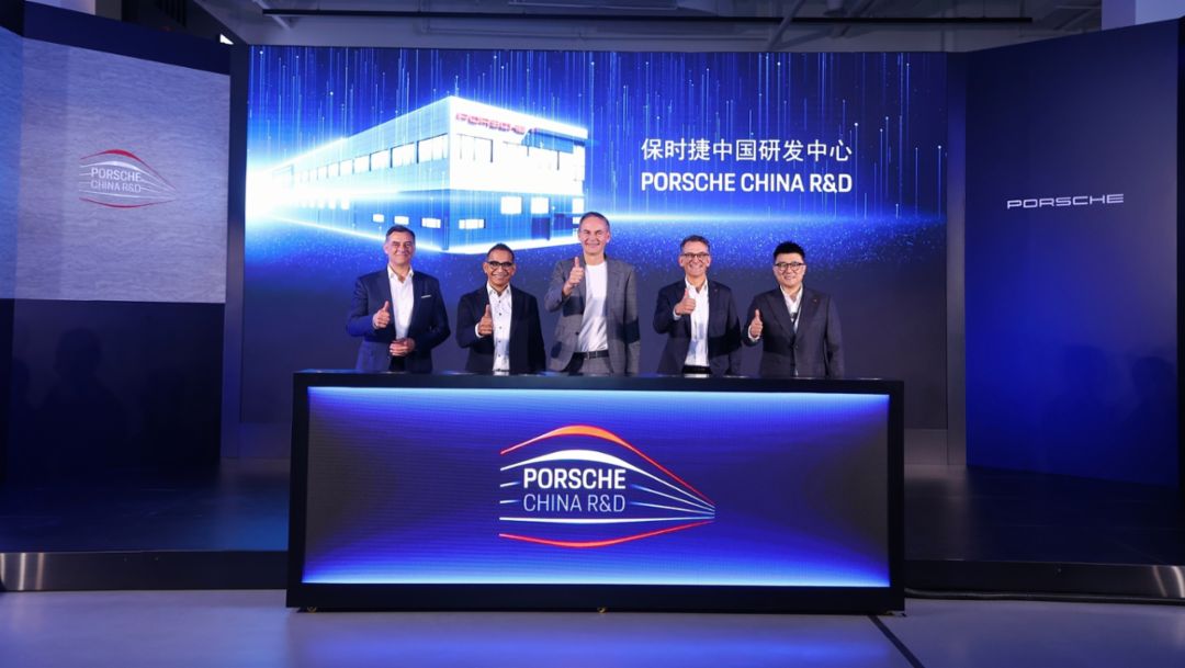 Dr. Michael Steiner, Deputy Chairman and Member of the Executive Board, Research and Development; Sajjad Khan, Member of the Executive Board, Car-IT; Dr. Oliver Blume, Chairman of the Executive Board; Alexander Pollich, President and CEO Porsche China, Hongkong and Macao; Li Nan, Head of Porsche China R&D, Vice President Technical Division Porsche China (l-r); Porsche China R&D, Shanghai, China, 2025, Porsche AG