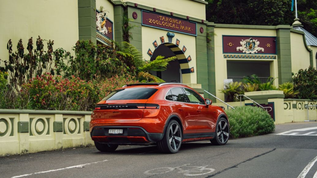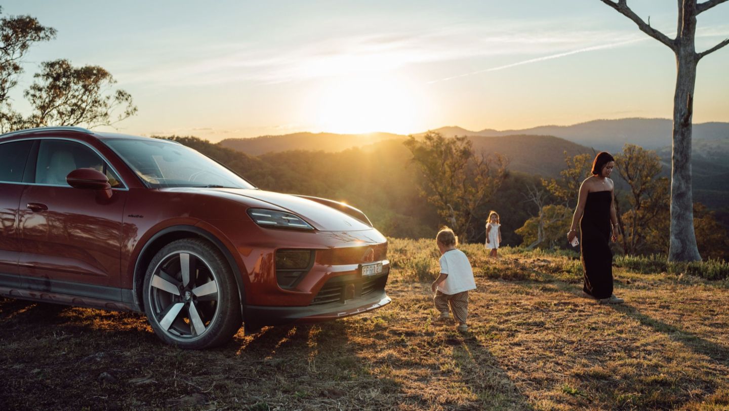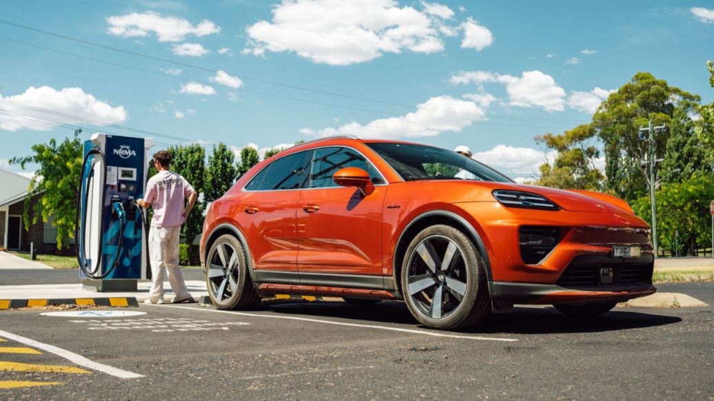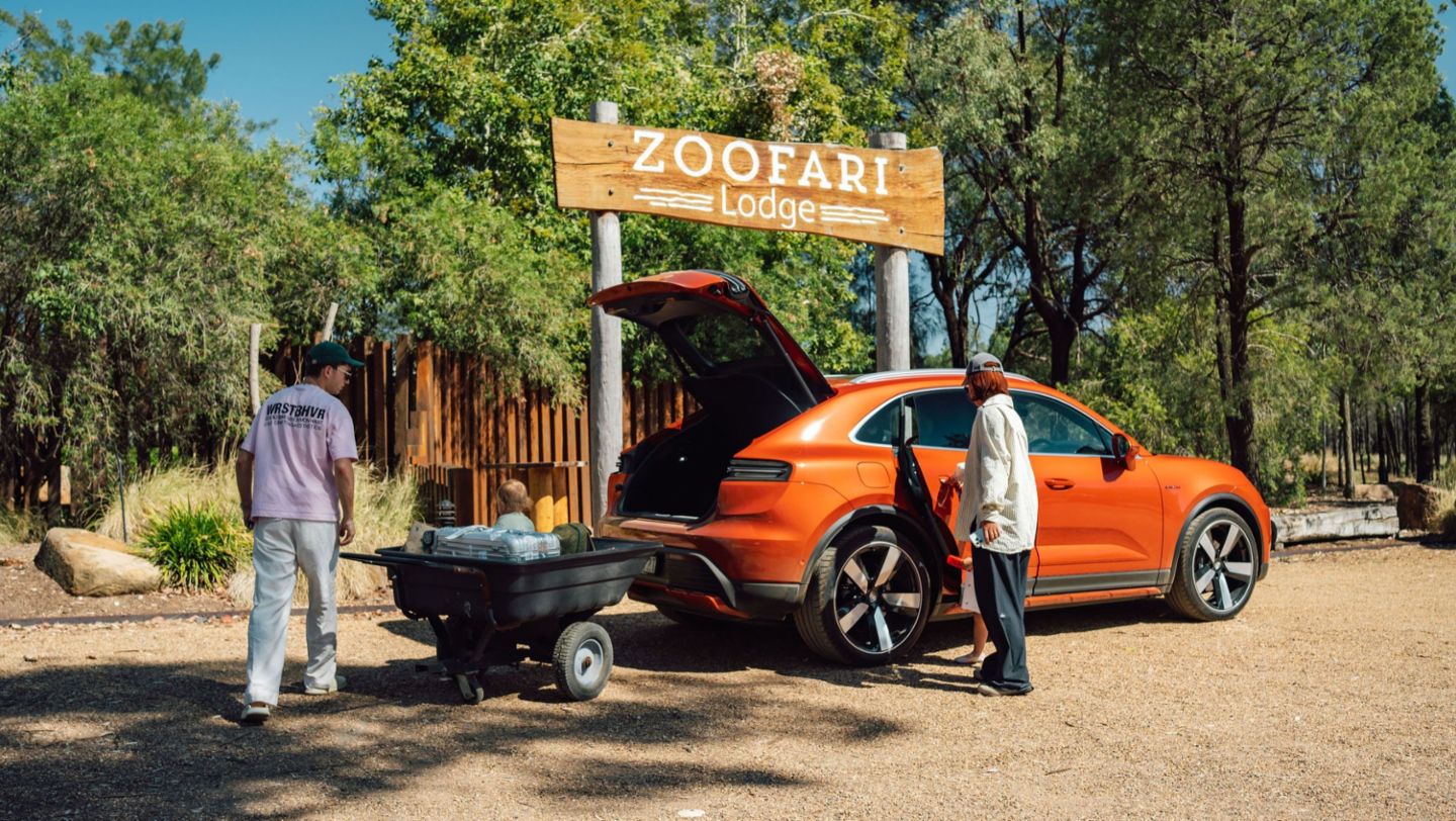 Werner and his family have arrived at Dubbo Regional Airport, about 300 kilometres north-west of Sydney. Their two kids fizz with excitement as the last of their bags are packed away in the back of their Papaya Metallic Macan, which sits fully charged and ready for the wide open roads ahead.