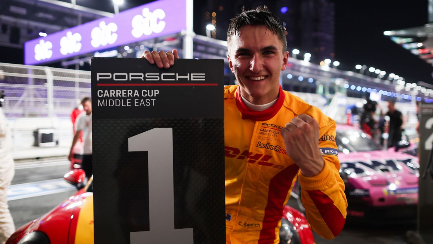 It might have been young 18-year old German driver Janne Stiak’s season, having clinched the 2024/2025 Porsche Carrera Cup Middle East Championship with a round to go for the DHL Team last weekend in Bahrain, but it was Caleb Sumich’s weekend for Round Six in Jeddah, taking outright victory in both races across the two days of the saeson finale.