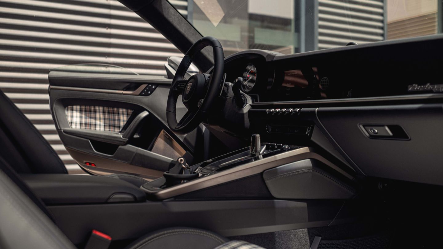 The unmistakable McKenzie tartan interior trim has returned for the seat covers and door panels, while the Porsche Turbo-exclusive colour of Turbonite makes its first appearance on a 911 and is also used on inlays in the rear engine cover, fuel cap, in the Porsche crest and also as a contrasting colour in the Turbo 50 model logo.