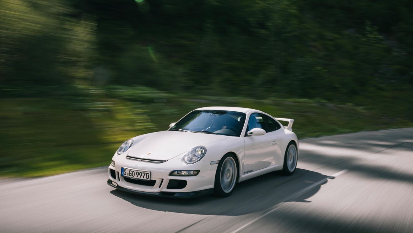 The first 911 GT3 model was introduced to the European market in 1999 as part of the 996 generation. It was one of the first production cars to officially lap the legendary Nürburgring-Nordschleife in less than eight minutes, with rally legend Walter Rӧhrl going around the famous track in just 7:56.33 minutes – a sensation at the time. The car distinguished itself from rear-wheel drive 911 Carrera models through a 30 mm reduction in ride height, a pronounced front fascia, visible side skirts and a fixed rear wing – all designed to reduce lift while still delivering a very efficient 0.30 drag coefficient. The angle of attack of the rear wing is adjustable for use on closed-course tracks.