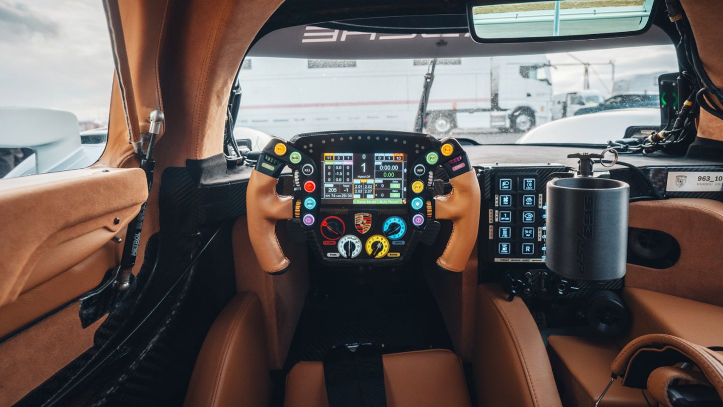 Possibly the greatest departure from the 963 race car occurs inside the 963 RSP. Following the lead of the handcrafted and completely bespoke interior of the 917 (which remains unrestored to this day) the 963 RSP features a mix of soft tan leather and Alcantara. Whereas the race car features very few comfort features, the 963 RSP is more accommodating – with the single piece carbon seat trimmed in leather with soft cushioning placed down the center and a fixed headrest mounted on the carbon fiber bulkhead. The seats are – in common with the race version – air conditioned. The leg cushions in the footwell as well as the roof lining and pillars have been retrimmed in light Alcantara while the steering wheel – where the majority of the vehicle’s functions are located – has been finished in leather. A light-hearted addition is a detachable 3D-printed cup holder capable of securely holding a Porsche travel mug.