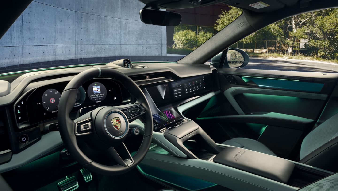 The features are complemented by an accent package in Silvershade, as well as an armrest in the center console embossed with “Porsche Exclusive Manufaktur” lettering. The vehicle key is also finished in Izabal Green and is presented in a case with decorative stitching in Delgada Green. The overall look is rounded off with black anodized aluminum door sill guards with the model designation illuminated in green, as well as black floor mats with decorative edging, emblems and stitching.