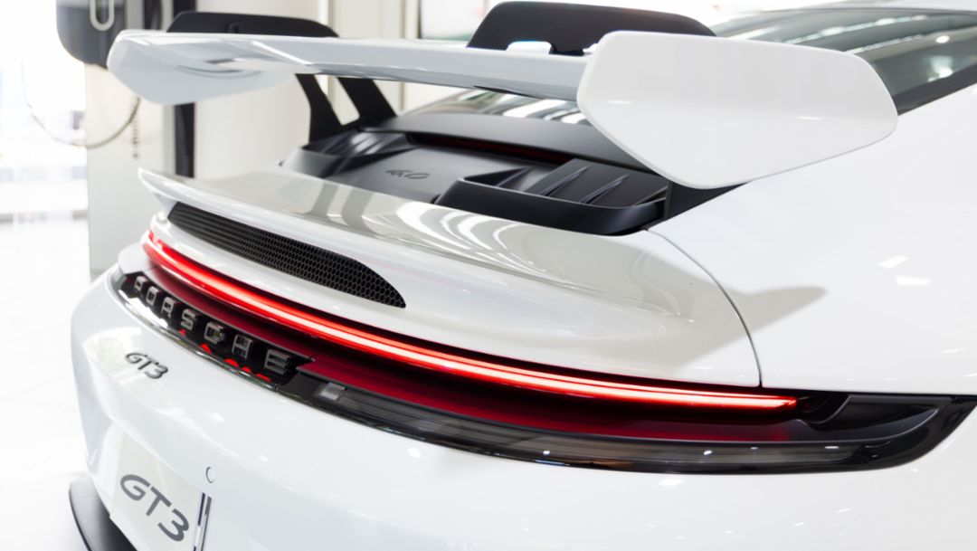 Por primera vez, el paquete Weissach está disponible para el 911 GT3, reforzando su carácter purista. Éste eleva el espíritu de competición al máximo nivel mediante la incorporación de componentes en fibra de carbono, como el capó, techo, carcasas de espejos y alerón, además de barras estabilizadoras y brazos de suspensión del mismo material. También incluye detalles exclusivos en el interior, como levas y molduras de carbono, que subrayan su ADN deportivo.