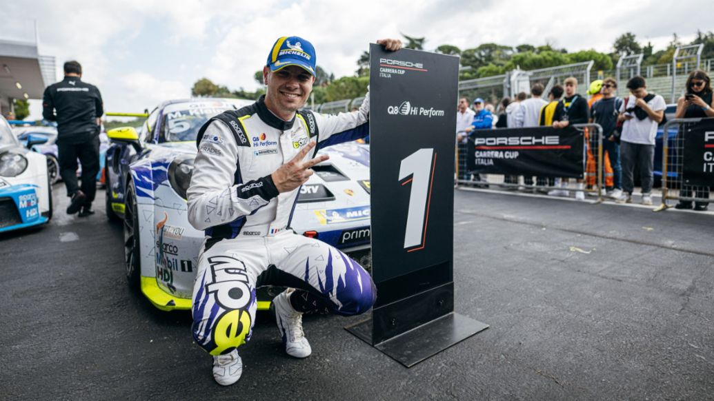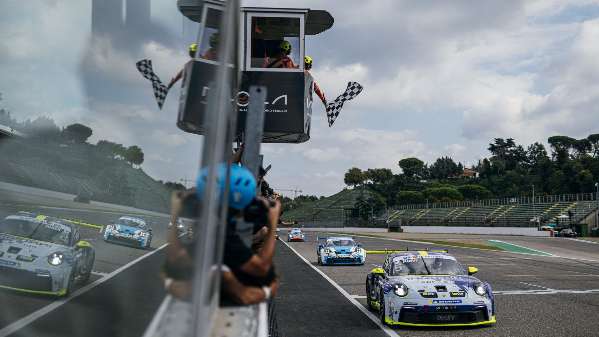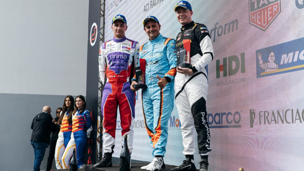 Il capoclassifica del Team Q8 Hi Perform ha a lungo condotto la corsa, ma alla ripartenza da una safety car ha perso la leadership in conseguenza di un emozionante sorpasso al limite effettuato proprio da Klein alla Piratella. A quel punto il transalpino si è involato verso il suo terzo successo stagionale, mentre nel frangente il rivale per il titolo ha perso ritmo ed è stato infilato anche da Tauscher, Braschi, tornato sul podio con la 911 GT3 Cup di Ombra Racing, e Levi, quarto come in gara 1 al rientro dopo due anni nel monomarca tricolore con il team TDE. Masters è dunque precipitato in quinta posizione ed è stato seguito da Lirim Zendeli con la seconda 911 GT3 Cup di BeDriver e da un sorprendente Jan Seyffert. Settimo assoluto al traguardo, il pilota tedesco di Target Competition celebra il successo nella categoria Rookie, nella quale ora si aggiunge al compagno di squadra Nathan Schaap e a Pietro Delli Guanti (Archesse Racing), entrambi costretti allo stop in gara 2, alla lista dei pretendenti al titolo.