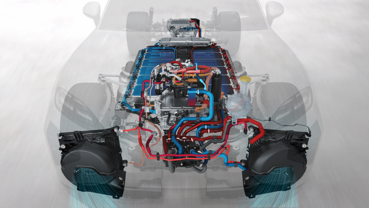 Un elemento fondamentale del sistema ad alta tensione è l'innovativo sistema di raffreddamento, che regola la temperatura della batteria sia dall'alto che dal basso. Questo doppio raffreddamento consente una regolazione precisa dell'intervallo di temperatura e garantisce che la batteria operi sempre nella fascia ottimale, indipendentemente dalle condizioni meteorologiche, dalla potenza di ricarica o dallo stile di guida. Per la prima volta saranno utilizzati ventilatori di pressione ad alta efficienza energetica, in grado di consumare circa il 15% di energia in meno rispetto alle ventole di aspirazione convenzionali. Ciò garantisce una capacità di ricarica uniformemente elevata e alte prestazioni con una perdita energetica minima, fattori fondamentali per l'efficienza complessiva della nuova Cayenne.
