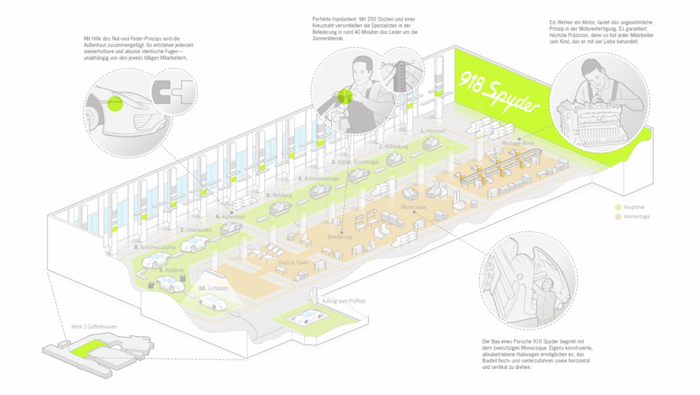 La manifattura della Porsche 918 Spyder a Stoccarda-Zuffenhausen cattura l’attenzione. Esteticamente, ma anche per quanto riguarda i processi e una serie di sviluppi innovativi nel campo dell'assemblaggio e del controllo di qualità. Per alcune di queste innovazioni, che soddisfano i requisiti più elevati in termini di ergonomia, si stanno depositando i brevetti. Certificano "che la nostra definizione di capacità innovativa va ben oltre l'auto", come afferma Michael Drolshagen che, come responsabile della produzione, ha gestito la realizzazione della manifattura e oggi la dirige. Di seguito in breve alcuni esempi significativi.